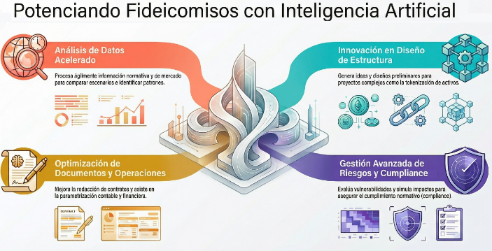 En el ámbito fiduciario, caracterizado por su complejidad jurídica, financiera, operativa y de cumplimiento normativo, la IA se presenta como una herramienta capaz de ampliar el horizonte del estructurador. Su uso permite explorar escenarios, modelar estructuras, validar supuestos y proyectar flujos con mayor rapidez, manteniendo siempre la esencia del diseño original y la finalidad económica del fideicomiso. La creatividad y la ingeniería financiera encuentran un nuevo punto de apoyo: la capacidad de la IA para procesar grandes volúmenes de información, identificar patrones y sugerir alternativas operativas que antes requerían semanas de análisis.